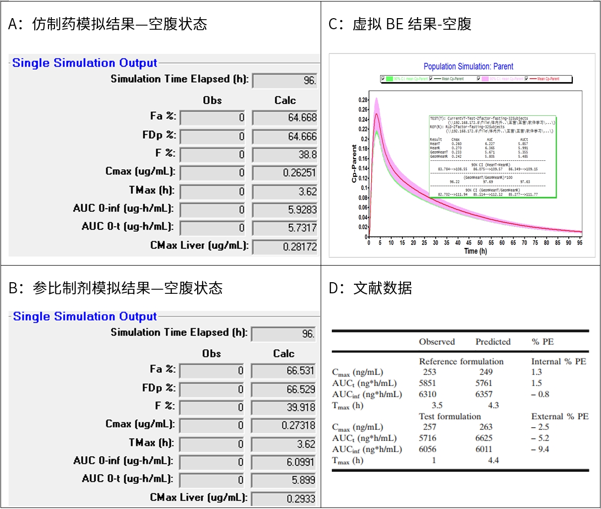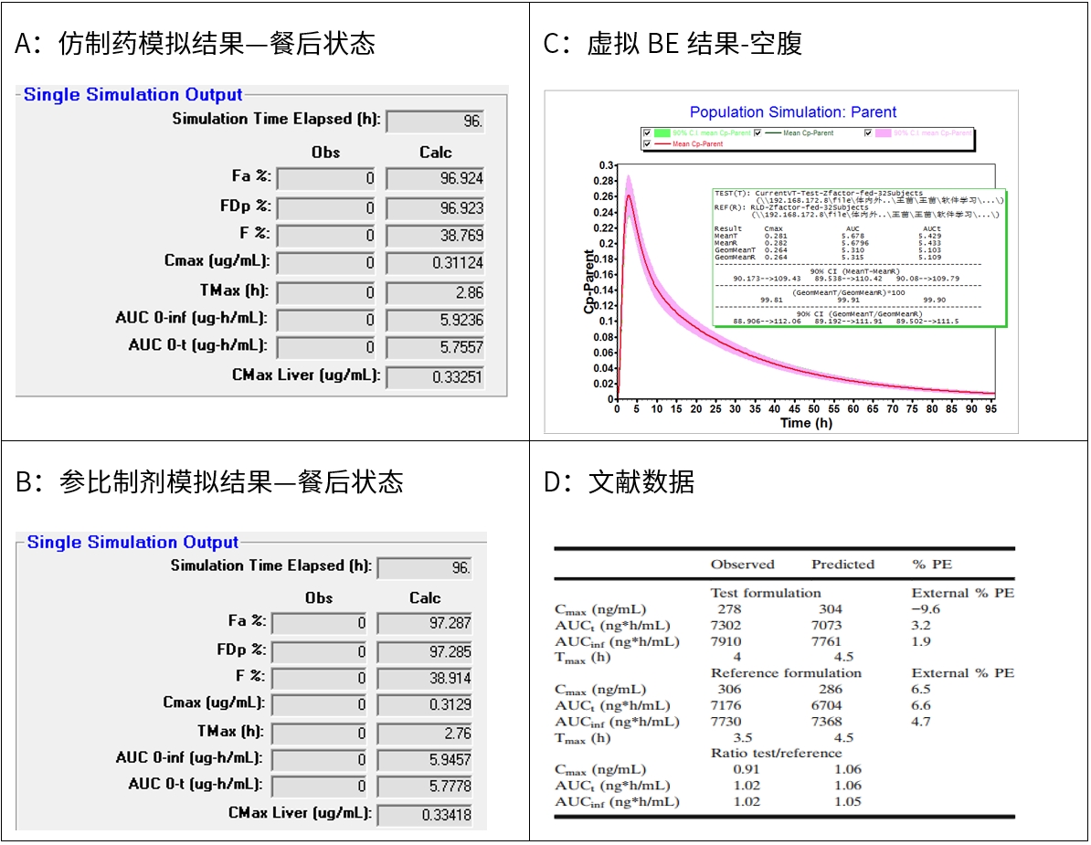 采用上述模型,32例受試者進行虛擬BE試驗,仿制藥和參比制劑的Cmax和AUC均為80.00%-125.00%范圍內,兩者具有生物等效性。外部驗證的模型PE值小于10%。