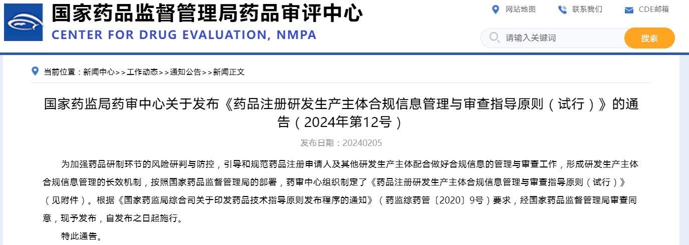 國家藥監(jiān)局藥審中心關于發(fā)布《藥品注冊研發(fā)生產(chǎn)主體合規(guī)信息管理與審查指導原則(試行)》的通告(2024年第12號)