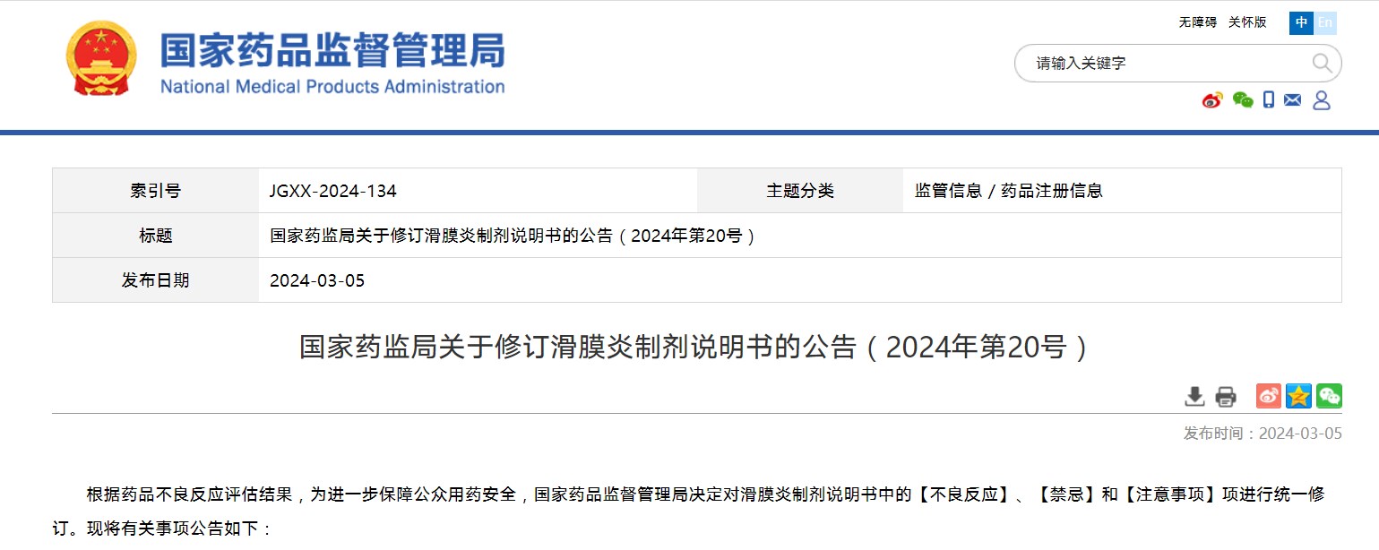 國家藥監(jiān)局關于修訂滑膜炎制劑說明書的公告(2024年第20號)