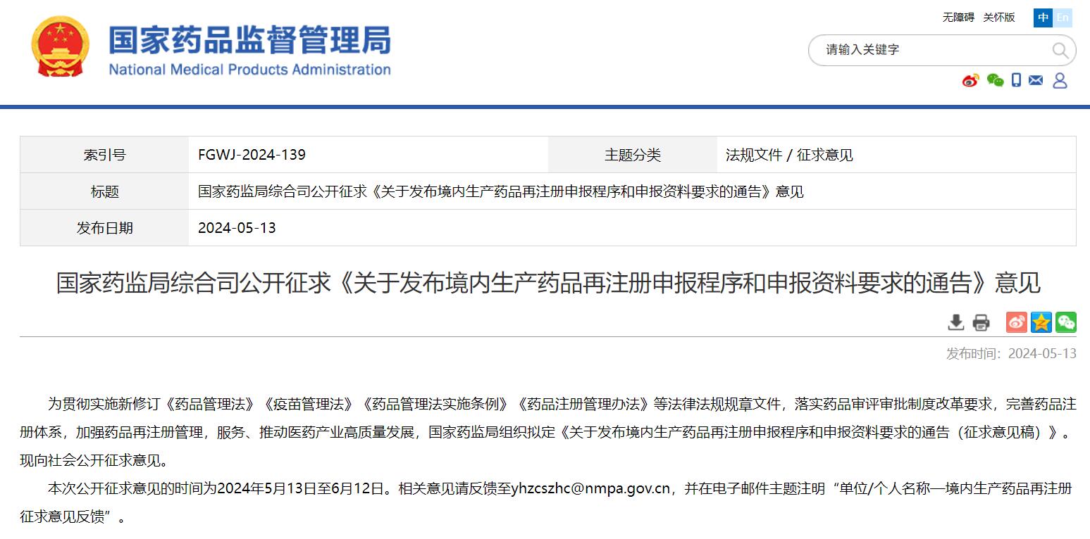 國家藥監(jiān)局綜合司公開征求《關于發(fā)布境內生產(chǎn)藥品再注冊申報程序和申報資料要求的通告》意見