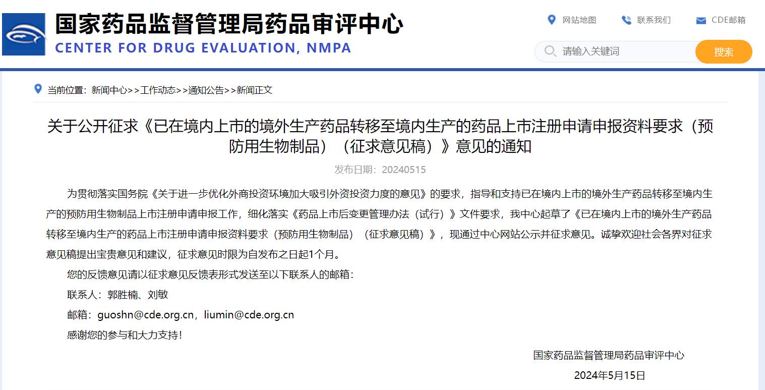 關于公開征求《已在境內上市的境外生產(chǎn)藥品轉移至境內生產(chǎn)的藥品上市注冊申請申報資料要求(預防用生物制品)(征求意見稿)》意見的通知