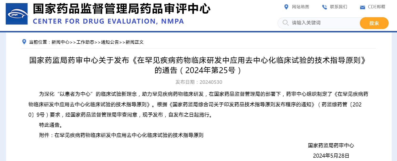 國家藥監(jiān)局藥審中心關(guān)于發(fā)布《在罕見疾病藥物臨床研發(fā)中應(yīng)用去中心化臨床試驗(yàn)的技術(shù)指導(dǎo)原則》的通告(2024年第25號)