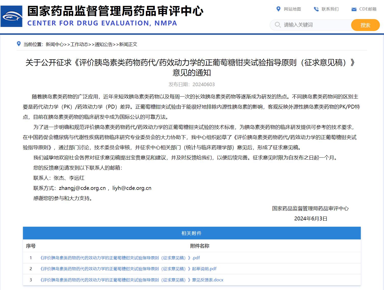 國家藥監(jiān)局藥審中心關(guān)于公開征求《評價(jià)胰島素類藥物藥代/藥效動(dòng)力學(xué)的正葡萄糖鉗夾試驗(yàn)指導(dǎo)原則(征求意見稿)》意見的通知