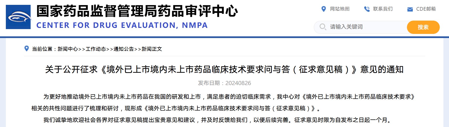 國家藥監局藥審中心關于公開征求《境外已上市境內未上市藥品臨床技術要求問與答(征求意見稿)》意見的通知