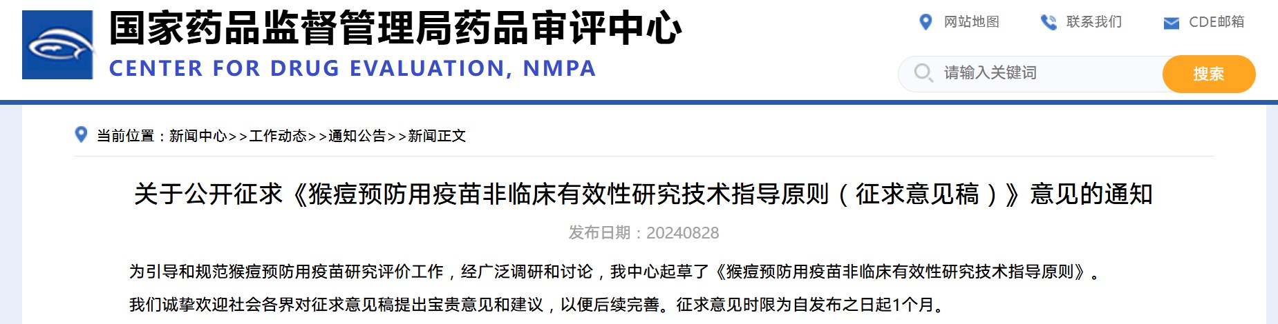關于公開征求《預防用猴痘病毒疫苗藥學研究評價技術要點(征求意見稿)》意見的通知