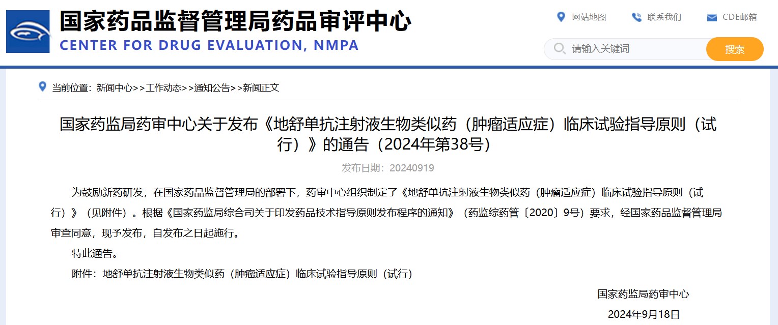 國家藥監(jiān)局藥審中心關(guān)于發(fā)布《地舒單抗注射液生物類似藥(腫瘤適應(yīng)癥)臨床試驗指導(dǎo)原則(試行)》的通告(2024年第38號)