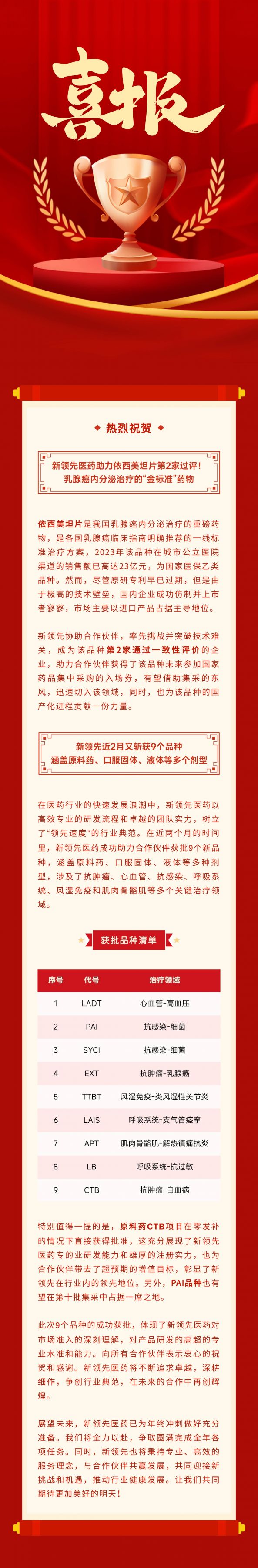 喜報 | 乳腺癌內分泌治療“金標準”藥物第2家過評!新領先醫藥近期又斬獲9個批件!