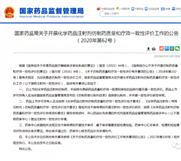 2020年5月14日,國家局一改往日習慣,在非假期前的工作日發(fā)布了重磅通告“國家藥監(jiān)局關(guān)于開展化學藥品注射劑仿制藥質(zhì)量和療效一致性評價工作的公告(2020年第62號)”(以下簡稱“通告”),與此同時,CDE同步發(fā)布《化學藥品注射劑仿制藥質(zhì)量和療效一致性評價技術(shù)要求》 -