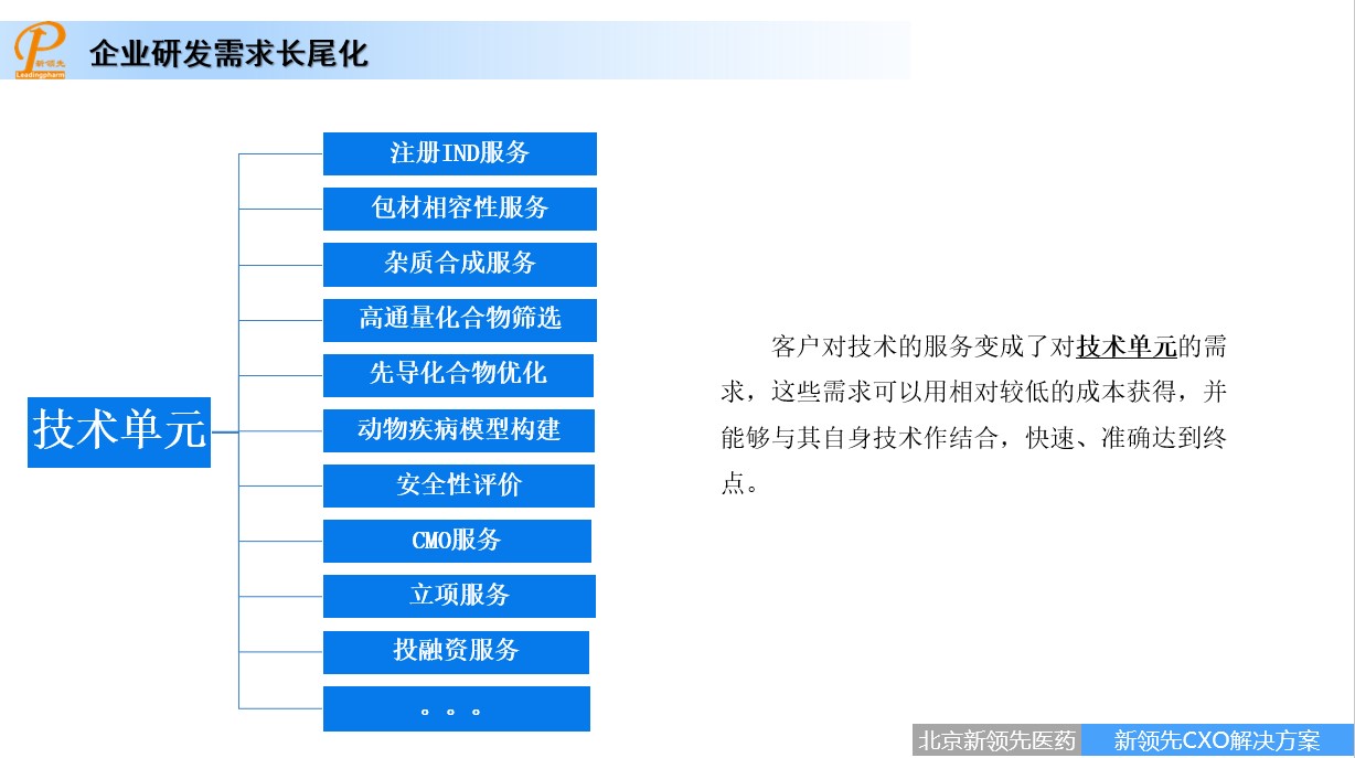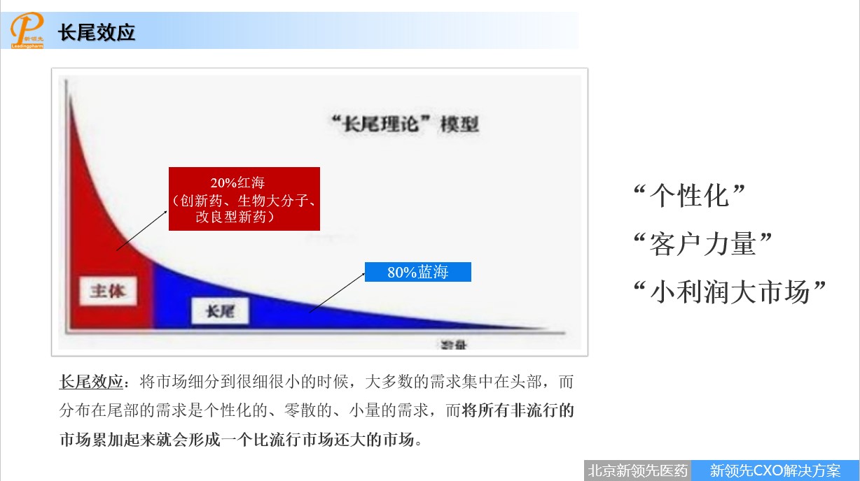 It is noteworthy that the "Leadingpharm CXO Ecosphere" has a new extension. Mr. Tao said that with the development of consistency evaluation and centralized purchasing, the R&D needs of enterprises are more unitized and fragmented, and the "long tail effect" appears. Mainstream market, mainstream customers, mainstream technology and first-class innovation are the heads of the demand curve, but due to the crowded track, they become the heads (20%) of the "28" Theory.For example, registration of IND services, package compatibility services, impurity synthesis services, high-throughput compound screening, optimization of lead compounds, establishment of animal disease models, safety evaluation, CMO services, even project establishment services, investment and financing services, etc., which are low in cost and can be quickly combined with their own technologies, become the blue ocean, which is the tail (80%) of the “28” Theory .